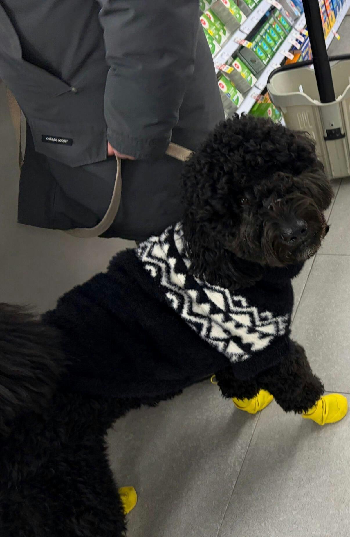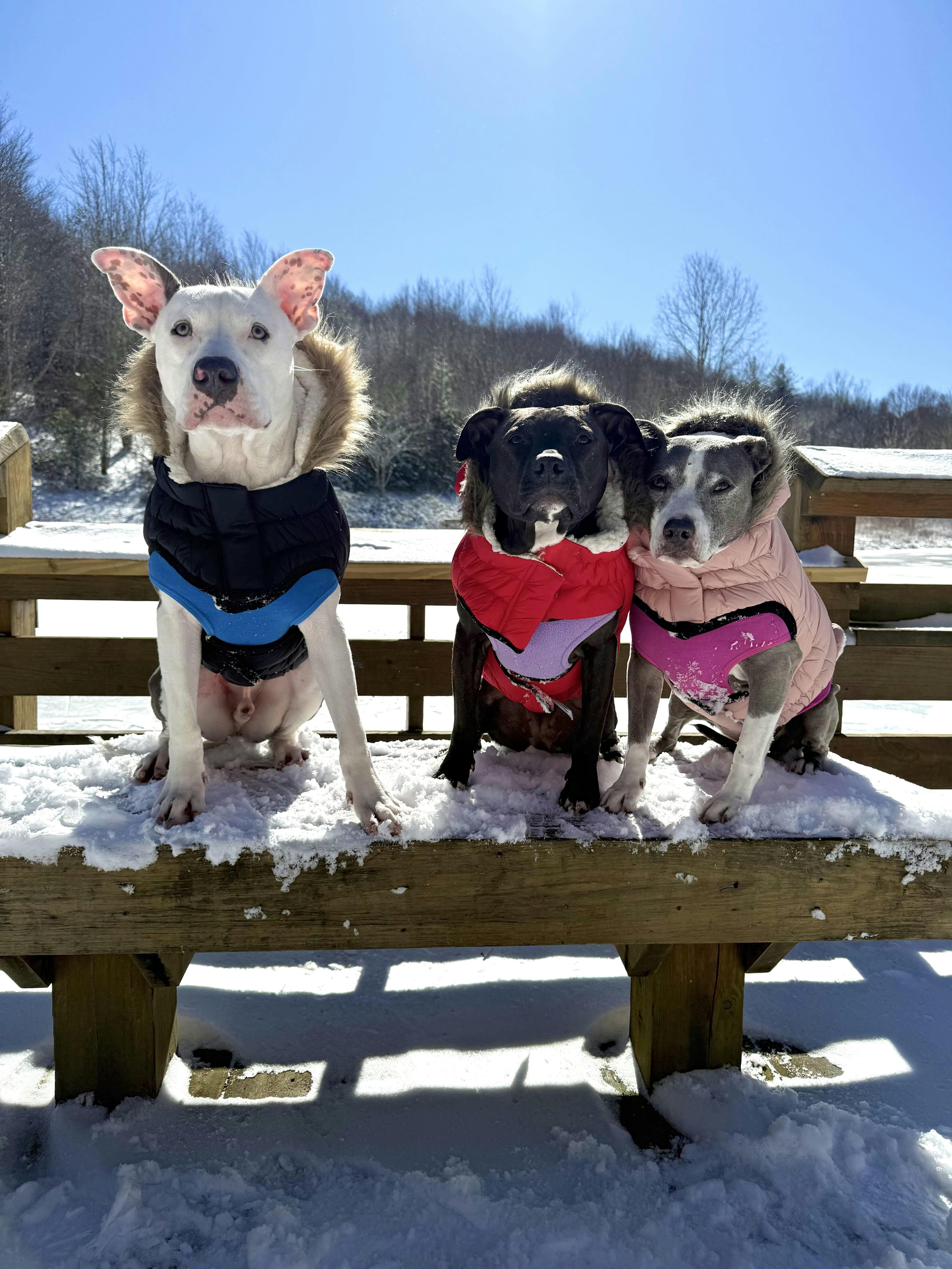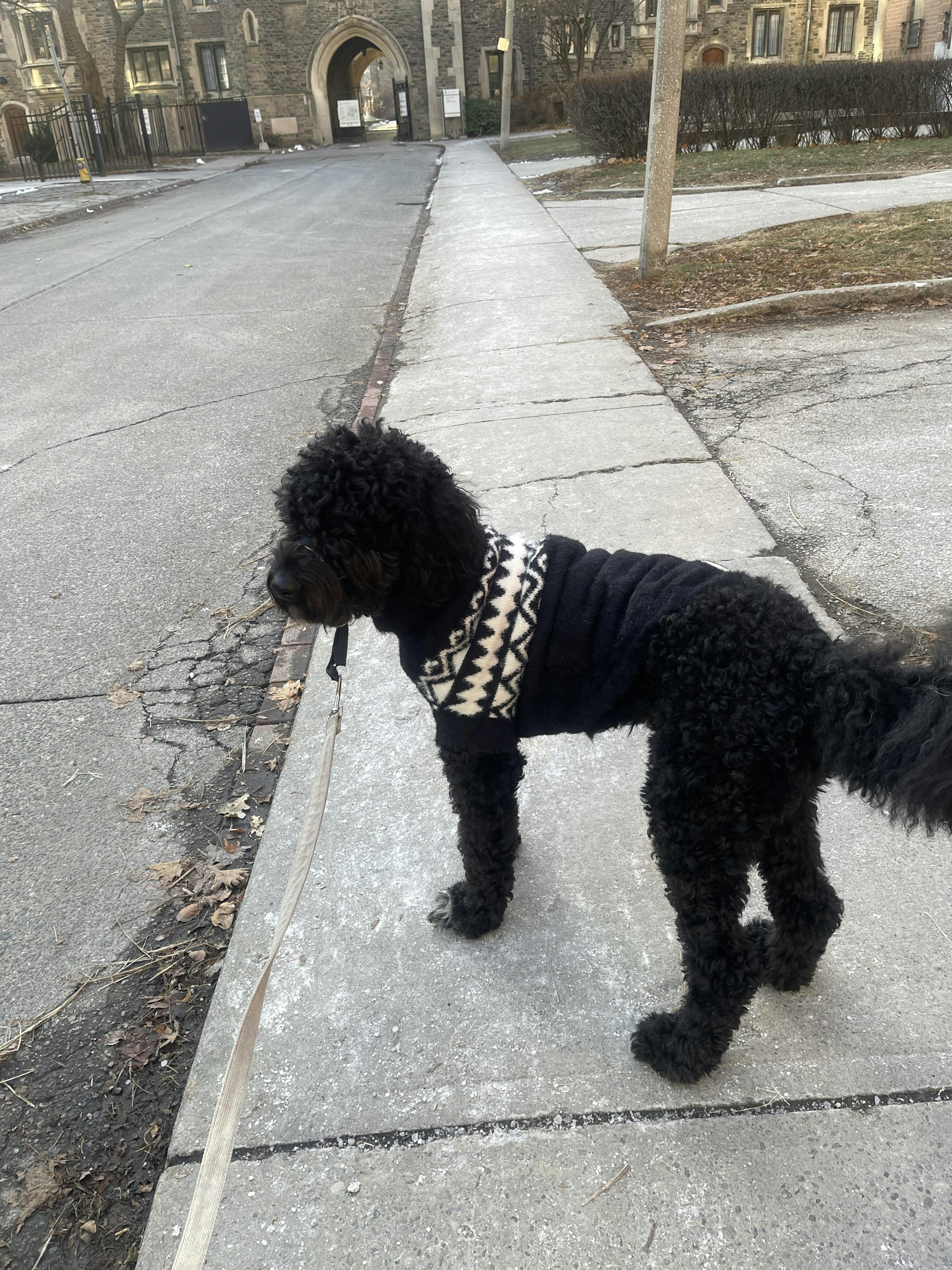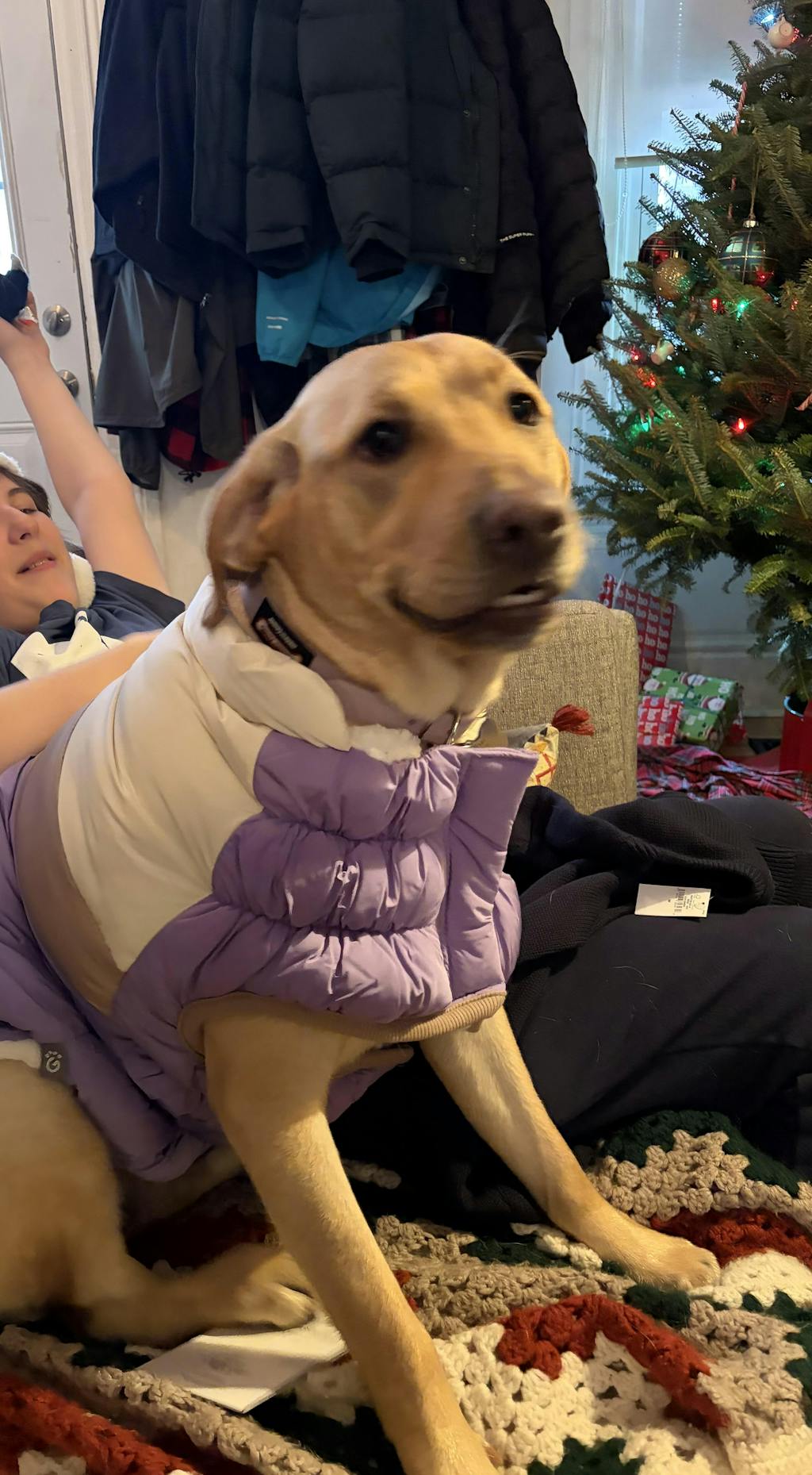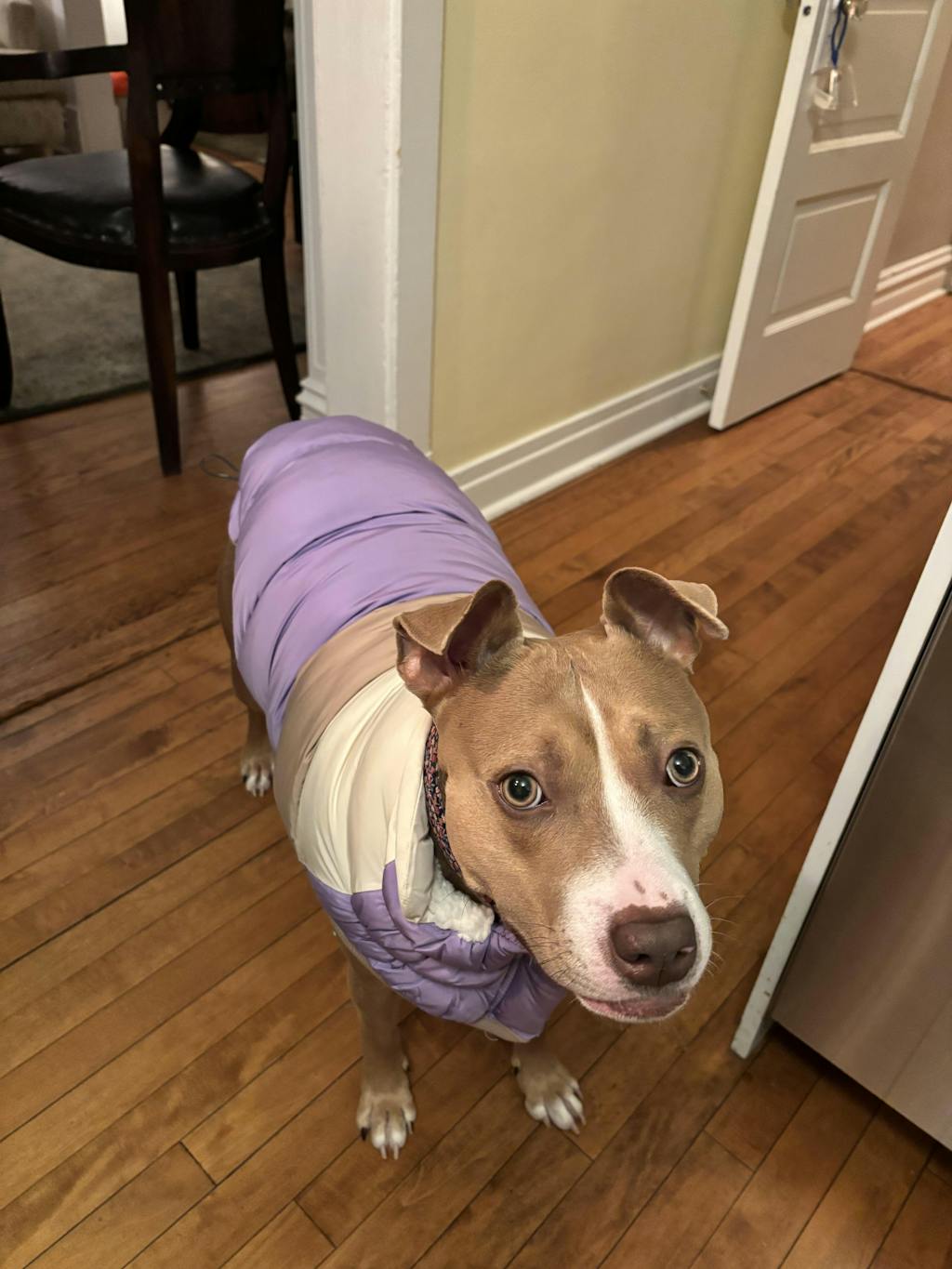 Super cute jacket, fits as described. Our dog loves wearing it and doesn’t fuss when we put it on her. The colour combination looks so pretty against her fur and she has received lots of compliments on walks. It has been great this week during the cold days. I ordered it Dec 23 and it was delivered Dec 24 in time for Christmas. Very fast! The fabric ripped in one spot, but I think that is to be expected, as our dog (a lab) loves to wrestle with other dogs at the park. It’s possible it got caught on a wood chip or tag or something. I sewed it up and it’s good as new.