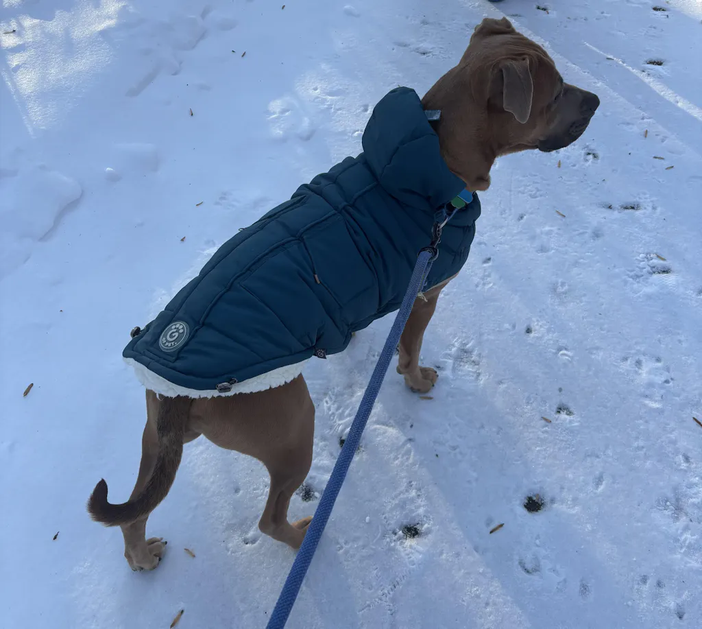 It has been a cold winter here and we were excited when the Nordic Dog Parka arrived. It is a high-quality coat with an excellent fit and has helped to keep our pup happy in the snow. The outer fabric resembles a puffer jacket, and the sherpa fleece lining provides warmth. What truly sets this coat apart from other dog jackets is its adjustability.