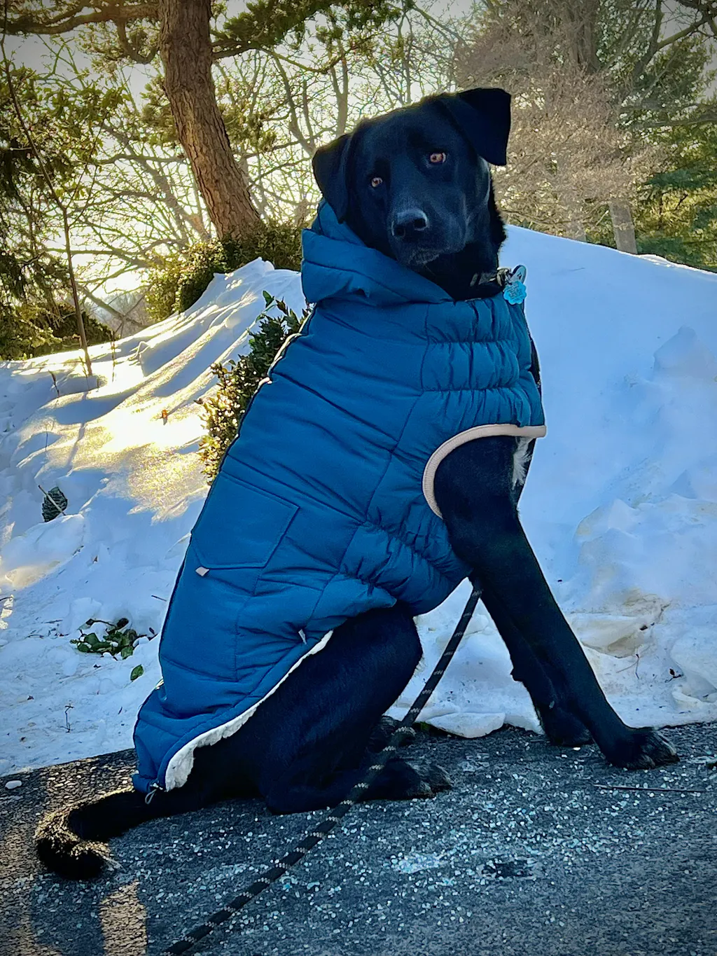 The teal color looks especially nice on our black dog. We like this coat so much that we purchased a second one—the Urban Dog Parka in Black with a fur-edged hood.