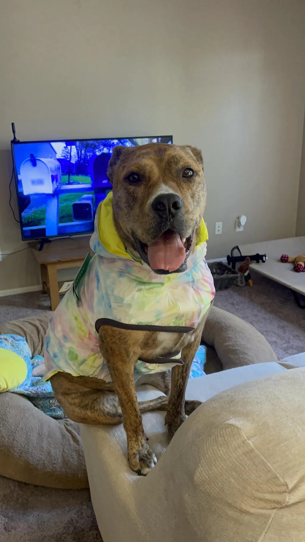 Nice and bright, easy to get on and off my 90-pound, barrel chested pitbull. It’s not quite as long as his winter coat (both 3x) so his butt gets a little wet, but still decent coverage.