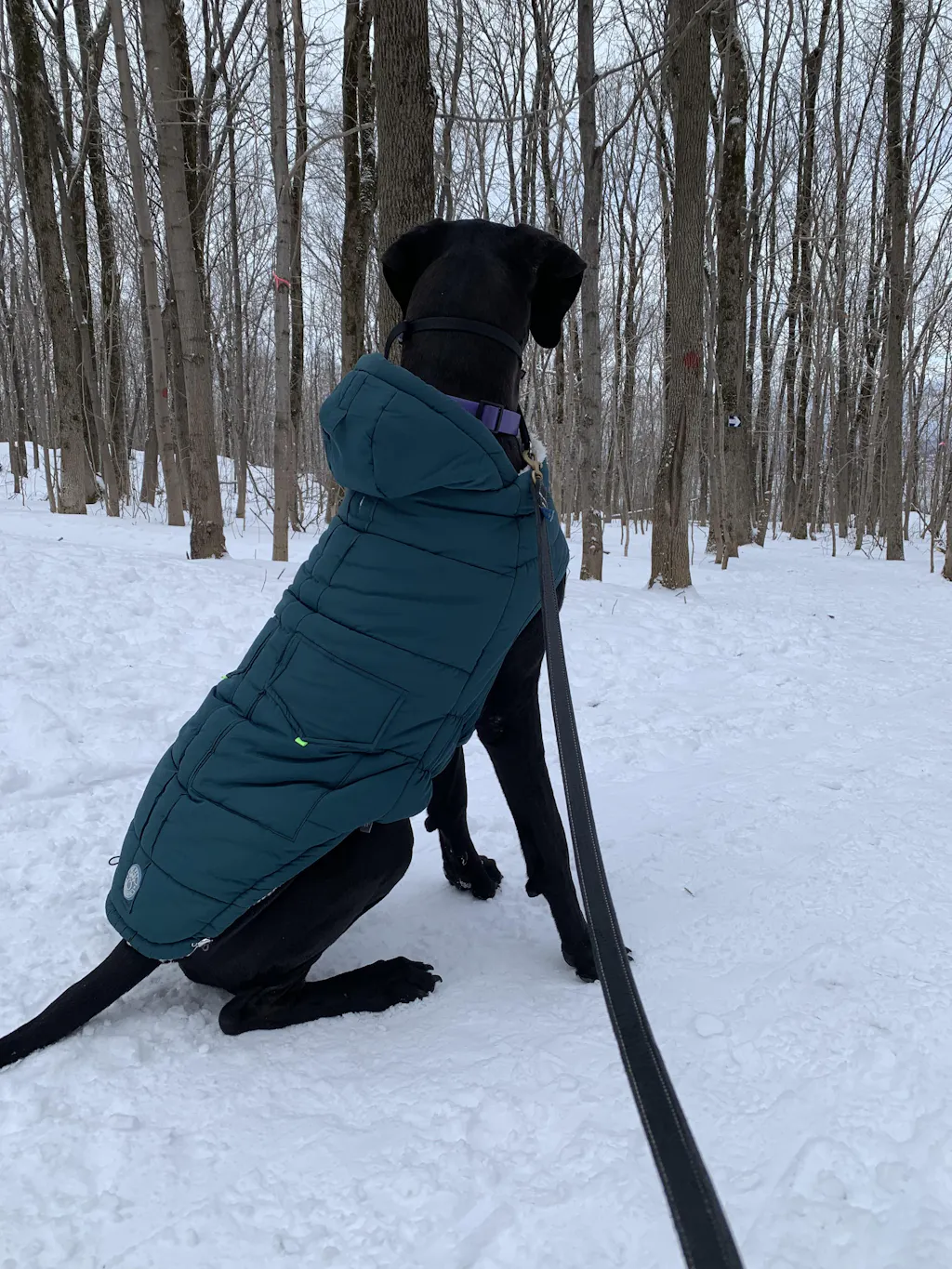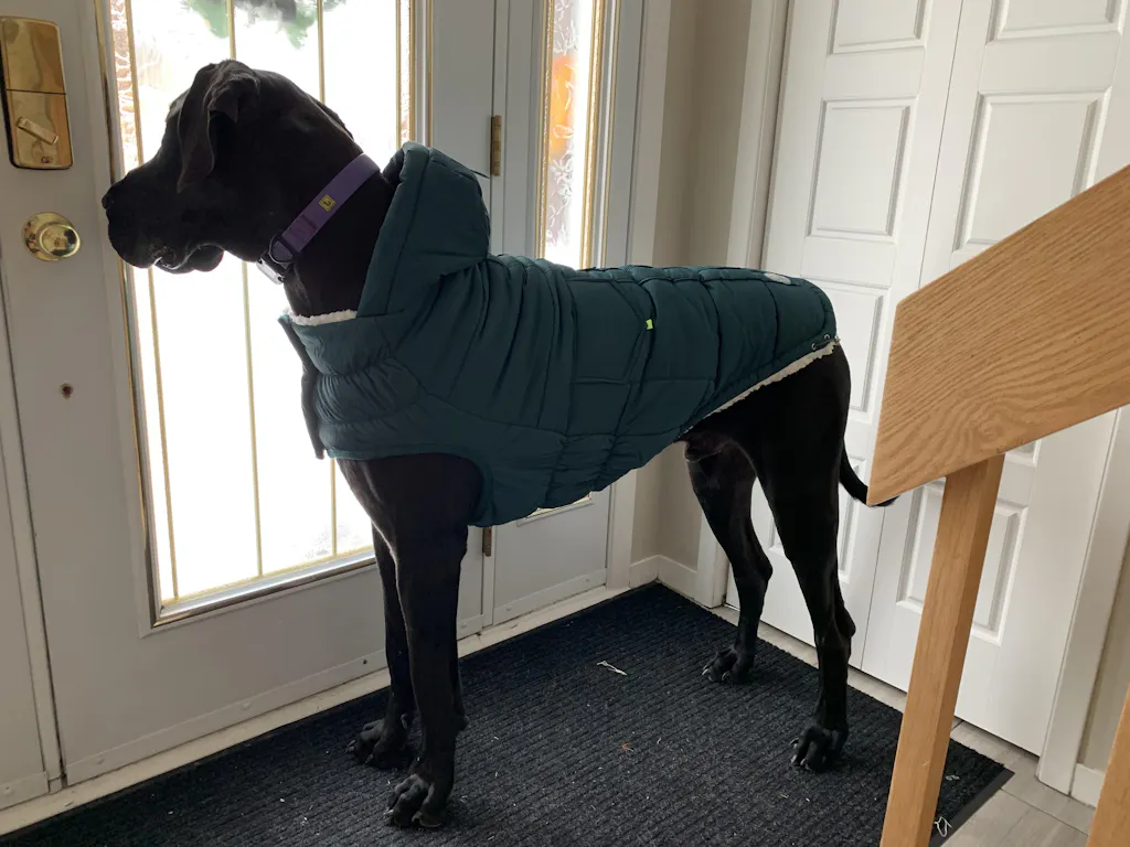 I purchased the parka for my 140 lb black Great Dane, and I am thrilled with it. The coat is a perfect fit, which is difficult to find for a giant breed. The Hazel colour looks great on him, too! My dog loves the snow, but he gets cold so quickly, and this coat helps keep him warm long enough for him to get his zoomies out. Highly recommend!