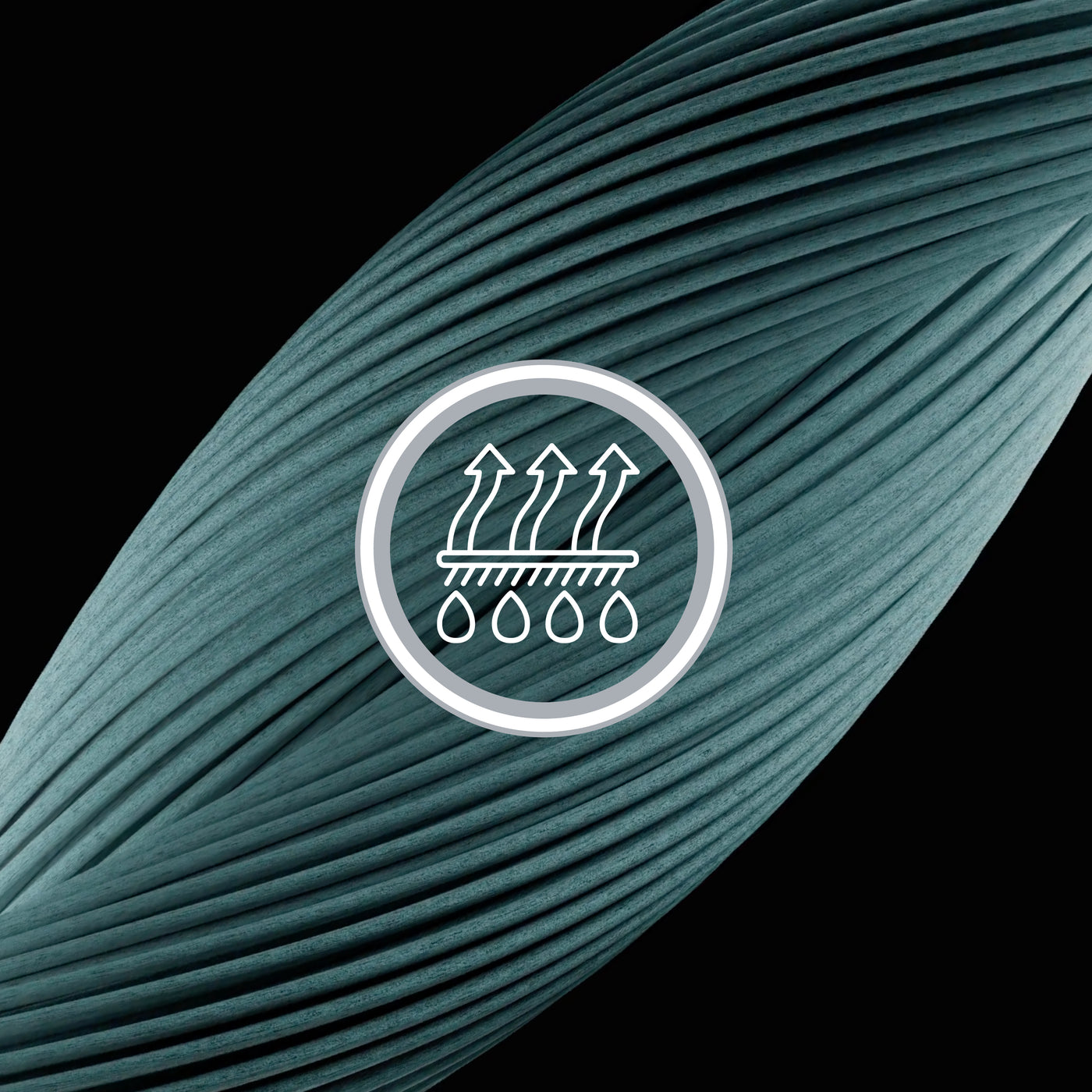 The moisture wicking properties are inherent in the fibers, wicking moisture away and keeping the body cool, dry and comfortable.